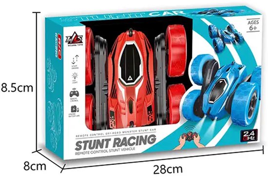 Pakket bevat: 1 auto met afstandsbediening, 1 afstandsbediening, 1 oplaadbare batterij, 1 USB-kabel. Deze stuntauto heeft een stabiel 2,4G-signaal en kan op afstand worden bestuurd en zonder storing naast meerdere auto's racen. Hij kan 360° draaien en aan beide kanten rijden, waardoor stunts nog spannender worden en spelen nog leuker!\nLeeftijd: 3+ Productafmetingen: 15,5*7,5*15,5 Materiaal: TPR+ABS Kleur: blauw, rood Batterij: 3,7 V-batterijpakket inbegrepen, 2 AA-batterijen niet inbegrepen.