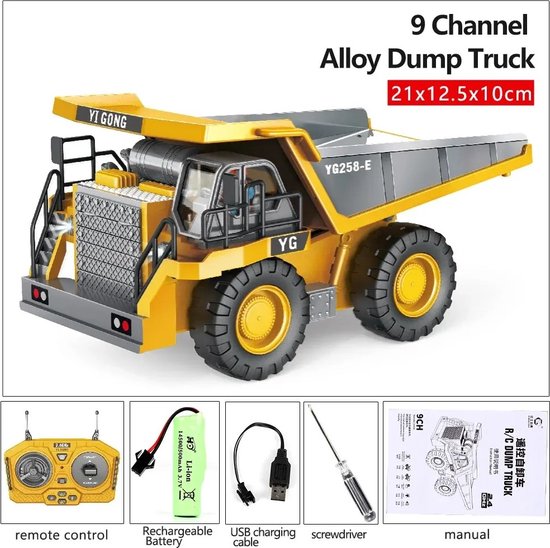 - Functies: 6-kanaals besturing, 270° manuele draaiing, 360° draaiing met afstandsbediening, graven met één druk op de knop, automatische demonstratie, ledverlichting, realistisch motorgeluid