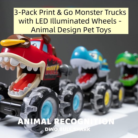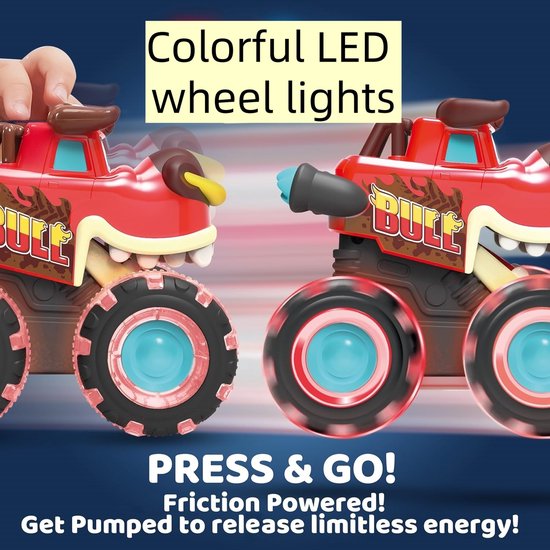 Duik in een leuke speeltijd met onze haai-, stier- en T-rex-speelgoedauto's! Elke auto is een kleurrijke, lichtgevende monstertruck, speciaal ontworpen voor jonge baby's. De wielen lichten op in prachtige kleuren tijdens het rollen, waardoor kinderen versteld staan.