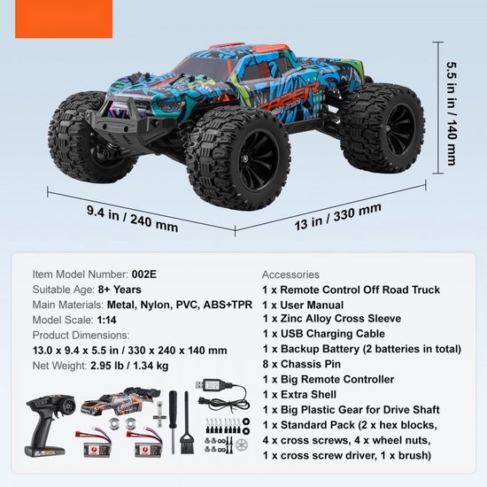 Compacte 1:14 RC-terreinwagen met krachtige vierwielaandrijving, metalen aandrijfas en gripvaste rubberbanden. De snelle 30.000 tpm motor, traploze snelheidsregeling en robuuste schokdempers leveren topprestaties op gras, grind, modder, zand en hellingen tot een maximale snelheid van circa 42 km/u.