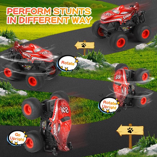 - RC Shark Car for Kids - This remote control monster truck has multiple functions that are fun for kids to play with, just make it come alive with 3 different lighting modes - from fast and furious flashing to slow and steady pulsing, or even continuous illumination. The rc monster truck can also play music through the built-in speakers and you can simply switch the music and turn it off by controller. Due to the special design, it is easy for kids to do 360°stunt to have fun too.Long press to the music button the truck will do a dance automatically.