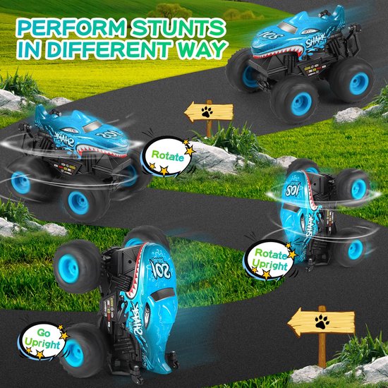 - RC Shark Car for Kids - This remote control monster truck has multiple functions that are fun for kids to play with, just make it come alive with 3 different lighting modes - from fast and furious flashing to slow and steady pulsing, or even continuous illumination. The rc monster truck can also play music through the built-in speakers and you can simply switch the music and turn it off by controller. Due to the special design, it is easy for kids to do 360°stunt to have fun too.Long press to the music button the truck will do a dance automatically.