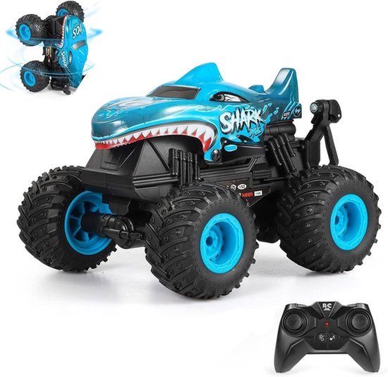 Afstandsbediening auto - 2,4 GHz All Terrain Shark Monster Truck speelgoed - RC vrachtwagen met muziek - 3 lichteffecten - 360 stunts mogelijk - Speelgoedcadeaus voor jongens en meisjes (blauw)