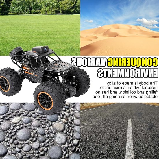 Deze off-road auto is uitgerust met een 720P HD camera en een Wi-Fi functie, waardoor je in staat bent om duidelijke foto's en video's te maken. Met de bijbehorende app kun je het voertuig eenvoudig bedienen met je smartphone, terwijl je in real-time beelden opneemt en opslaat.