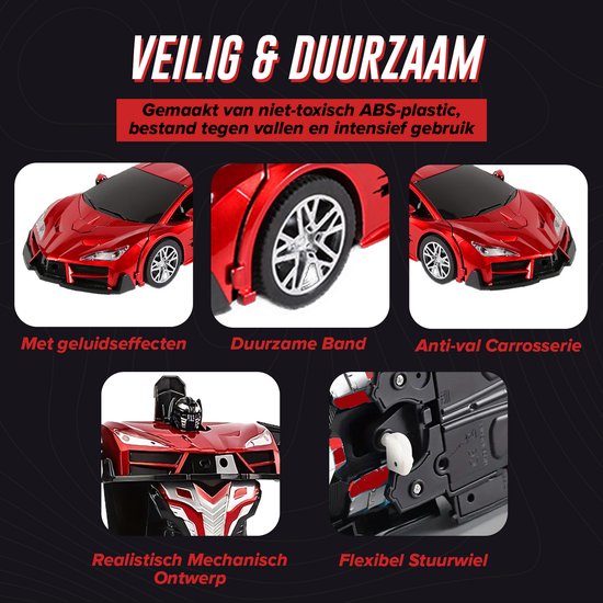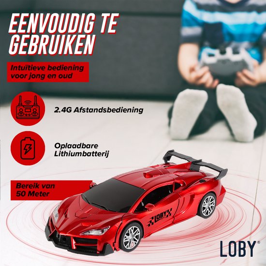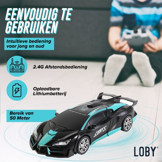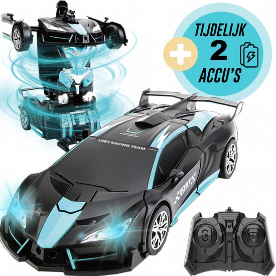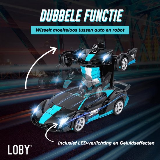 De bestuurbare auto van Loby is precies wat jij en je zoon of dochter nodig hebben! Switch razendsnel tussen auto en robot en laat iedereen versteld staan met jouw nieuwe rc auto! Met zijn eenvoudige bediening, veilige en duurzame ontwerp en 360 rotatiemogelijkheden, zal deze auto zeker een favoriet worden in huis. Kom in actie en laat je verbazen!