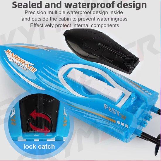 De boot ondersteunt 360° rotaties, S-vormig varen en zelfcorrigerende kantelbewegingen, waardoor hij altijd weer rechtop komt in het water. Het volledig afgesloten en waterdichte ontwerp beschermt de interne elektronica tegen waterinfiltratie.