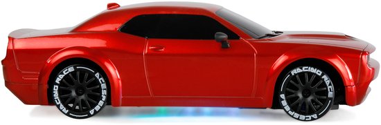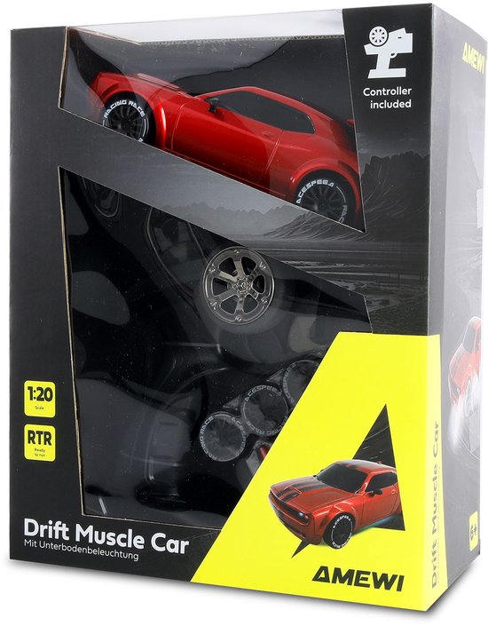 De op afstand bestuurbare Drift Muscle Car op schaal 1:20 biedt maximale prestaties en spectaculaire showeffecten: de schakelbare bodemverlichting met drie kleuren en zeven modi is bijzonder opvallend. Deze geeft het voertuig een unieke uitstraling en creƫert indrukwekkende effecten, vooral tijdens het driften in de schemering of in het donker. De nauwkeurige proportionele bediening van gas en besturing maakt nauwkeurige manoeuvres en realistisch rijgedrag mogelijk, wat het rijplezier aanzienlijk verhoogt. Een ander voordeel voor beginners is de gyrostabilisatie, die via de afstandsbediening kan worden aangepast. Deze houdt het voertuig betrouwbaar in de drift en zorgt zo voor snel leerresultaat. Als RTR-versie (Ready-to-Run) is de Drift Muscle Car direct klaar voor gebruik. Inclusief een ergonomische pistoolvormige afstandsbediening, een krachtige Li-ionaccu met een rijtijd tot 20 minuten en de bijbehorende USB-oplaadkabel. De schakelbare ledverlichting aan de voor- en achterzijde zorgt voor goed zicht. De krachtige vierwielaandrijving (4WD) garandeert optimale tractie en controle in elke situatie. Driftwielen met harde kunststof banden zijn al gemonteerd voor coole drifts, en voor klassiek gebruik op de weg zijn er ook wielen met rubberen banden inbegrepen, waardoor het voertuig flexibel kan worden aangepast. De storingsvrije 2,4 GHz afstandsbediening zorgt voor een stabiele verbinding zonder interferentie en maakt het mogelijk dat meerdere bestuurders tegelijkertijd kunnen rijden zonder frequentieoverlap. De topsnelheid tot 20 km/u kan via de zender traploos worden aangepast, zodat deze optimaal aansluit op de vaardigheden en de omgeving van de bestuurder. De trim van de voorwielen kan ook direct via de afstandsbediening worden aangepast, zodat u altijd perfect rechtuit kunt rijden. De set bevat zes pylonen waarmee u snel uw eigen driftroute kunt uitzetten. Hoogtepunten: Schakelbare bodemverlichting met 3 kleuren en 7 modi: voegt een unieke stijl toe en verbetert de rijervaring met coole showeffecten tijdens het driften, vooral in de schemering. Proportionele besturing (gas en besturing): Gevoelige controle over realistische wendbaarheid en dus nog meer rijplezier. Gyrostabilisatie met afstandsbediening: Bijzonder beginnersvriendelijk, sneller leerresultaat en minder frustratie dankzij een constanter rijgedrag. Extra functies: RTR (Ready-to-Run) versie inclusief afstandsbediening, accu en oplaadkabel. Bijpassende Li-ion accu voor lange rijtijden tot wel 20 minuten. Schakelbare ledverlichting voor en achter. 4WD-aandrijving. Driftwielen met harde kunststof banden. Reserve wielen banden zijn ook inbegrepen. Storingsvrij 2,4GHz-systeem. Topsnelheid tot 20 km/u. Maximumsnelheid traploos instelbaar via afstandsbediening (dual rate). Trimmen van de voorwielen bestuurd met afstandsbediening Zes pylonen inbegrepen Technische specificaties: Schaal: 1:20 Lengte: 210 mm Breedte: 85 mm Hoogte: 60 mm Gewicht (gebruiksklaar inclusief accu): 222 g Materiaal: Kunststof Aandrijflijn: 4WD Accu: LiPo 2S 7,4 V 300 mAh, Molex-connector, 36 x 20 x 10 mm, 17 g Gebruiksduur: tot 20 minuten Topsnelheid: tot 20 km/u Afstandsbediening: 3-kanaals 2,4 GHz-pistool Bereik: 50 m Oplader: USB-kabel Oplaadtijd: 60-70 minuten Inbegrepen in de levering: Model Afstandsbediening Accu Oplaadkabel 6x pylonen 4x reserve wielen Schroevendraaier Instructies Handleiding (Duits/Engels) Benodigde accessoires: 3x 1,5V AA-batterijen voor de afstandsbediening