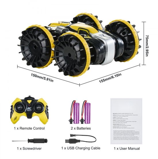 Stuntkracht zonder grenzen Dankzij de 180°-flips en 360°-spins wissel je moeiteloos tussen rollen, draaien en doorrijden. De auto presteert even goed op asfalt als op water, waardoor elk ritje spectaculair wordt.