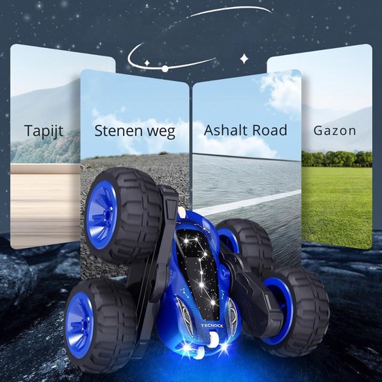 Deze op afstand bestuurbare auto valt direct op met een blauw-zwart sterrenhemel design en LED-ademlichten die fonkelende sterren simuleren. Perfect voor spectaculaire ritten, ook in het donker, en een echte blikvanger tussen andere RC auto’s.