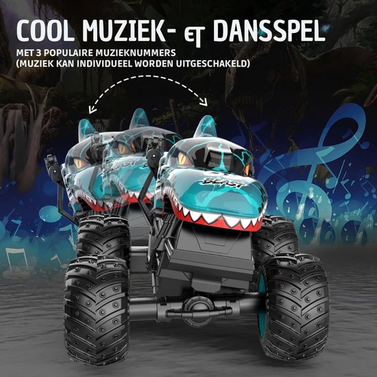 Deze op afstand bestuurbare monster truck in opvallende groene kleur zorgt voor eindeloos speelplezier. Met coole muziek, ritmische knipperlichten en een stoer, fantasierijk design is dit dé RC auto die kinderen meteen aanspreekt. Perfect als cadeau voor jonge avonturiers!