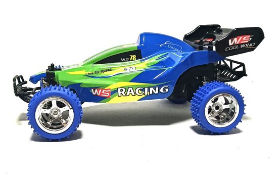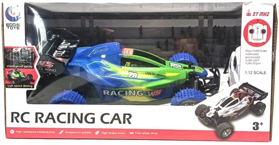 deze rc-buggy is ontworpen voor ruwterrein.de auto heeft vering voor en achter,en de auto is uitgerust met antislipbanden daardoor heeft de auto goede grip op de ondergrond.de metalen schokdempers,geven de auto een goed dempend effect. als de auto met hoge snelheid gaat rijden. dit speelgoed is voor kinderen vanaf 3 jaar en ouder. • Uitgerust met een 4 kanaals afstandsbediening,