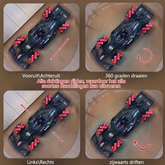 Geen bochten? Geen probleem! Dankzij 4WD, krachtige motoren en Mecanum-wielen draait, drifft en roteert deze F1-racer soepel in elke richting - zelfs op ruw terrein. Beheers allerlei moeilijkheidsgraden! Voer continue 360° drifts uit op de plaats, waarbij je coole bogen tekent; maak nauwkeurige zijwaartse slides en luchtsprongen tijdens bochten op hoge snelheid, enzovoort. Dit alles kun je stabiel uitvoeren dankzij het flexibele chassisontwerp en het krachtige vermogen, wat zorgt voor een verbluffende visuele impact en een meeslepende rijervaring.