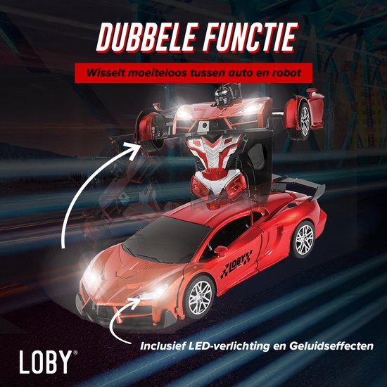 De bestuurbare auto van Loby is precies wat jij en je zoon of dochter nodig hebben! Switch razendsnel tussen auto en robot en laat iedereen versteld staan met jouw nieuwe rc auto! Met zijn eenvoudige bediening, veilige en duurzame ontwerp en 360 rotatiemogelijkheden, zal deze auto zeker een favoriet worden in huis. Kom in actie en laat je verbazen!