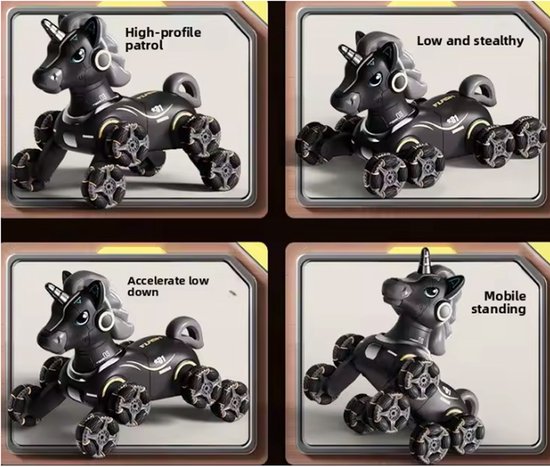 Deze unieke RC eenhoorn combineert fantasie met technologie. Dankzij de 8 multidirectionele wielen rijdt hij soepel vooruit, achteruit en zijwaarts, en draait hij moeiteloos rond. De afstandsbediening zorgt voor eenvoudige en nauwkeurige besturing. Met ingebouwde licht- en geluidseffecten wordt elke rit een echte belevenis. De eenhoorn is uitgerust met een oplaadbare lithiumbatterij en wordt geleverd met accessoires voor direct speelplezier. Het robuuste ontwerp en de stabiele constructie maken hem geschikt voor zowel binnen als buiten. Een perfect cadeau voor kinderen die dol zijn op actie en fantasie.