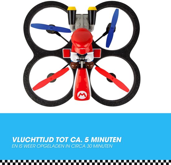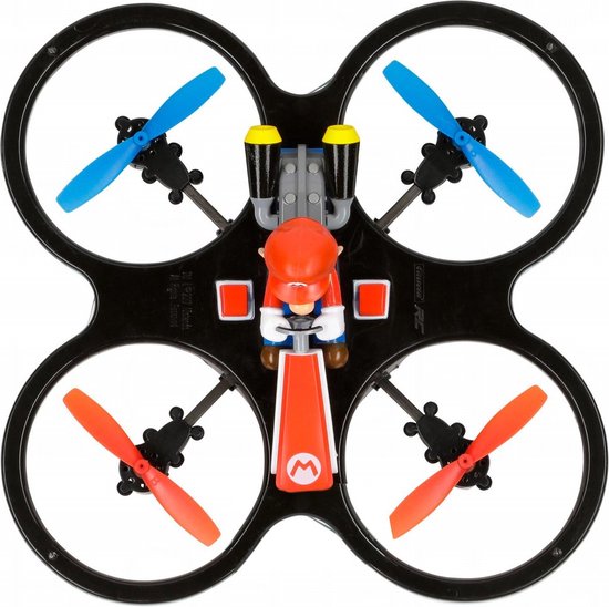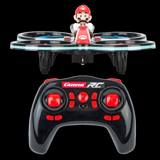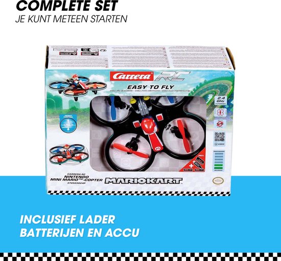 Ontdek nu de Mini Mario-copter op ! De quadrocopter is het nieuwste familielid tussen de Carrera RC Nintendo Mario KartTM-helden en biedt ongeƫvenaard vliegplezier. Met een indrukwekkende vlieghoogte zoemt hij door de lucht en dankzij de 2,4 GHz Digital Proportional-technologie is hij klaar voor gebruik. Met een rotor diameter van 5,5 cm en de extra stabiele Rotor Protection Cage biedt deze drone optimale bescherming tijdens zijn vlucht van maximaal 7 minuten. Zelfs jonge piloten kunnen met de Mini Mario-copter probleemloos opstijgen dankzij functies zoals de beginners- en geavanceerde modus, automatische start- en landfunctie en automatische hoogtecontrole. Bovendien is de drone uitgerust met een oplaadbare batterij en heeft hij een oplaadtijd van slechts 30 minuten. De Mini Mario-copter is een waar technologisch hoogstandje en perfect voor alle Mario KartTM-fans vanaf 8 jaar. Verrijk uw vliegavonturen met deze hoogvlieger en ervaar Mamma mia!-plezier in de lucht!