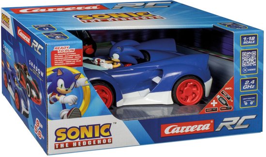 Sonic de blauwe egel is terug, sneller dan ooit – dit keer met Carrera RC power! Stap in zijn zilver-blauwe racewagen en beleef razendsnelle avonturen rechtstreeks uit het Team Sonic Racing-universum. Met zijn opvallende design, LED-koplampen en robuuste luchtbanden is deze op afstand bestuurbare auto een absolute blikvanger op elk parcours – binnen én buiten.