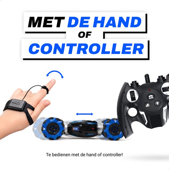 Met de handcontroller bestuur je met enkele handgebaren de auto van links naar rechts en vooruit en achteruit. Ook transformeert de stuntauto met een simpel handgebaar (of een druk op de controller), van platte racer – keihard rijden over een onverharde weg – naar hoge off-roader, waarmee je kunt stunten over obstakels en onverhard terrein. Bij het starten en rijden van de auto hoor je het gave V8 geluid. Wil je andere geluiden horen, dan kun je kiezen uit verschillende muziektracks. Ook helemaal top aan deze stuntauto is de verlichting aan de voor- en zijkant. In het donker geeft dit een spectaculair effect.