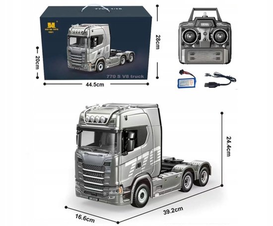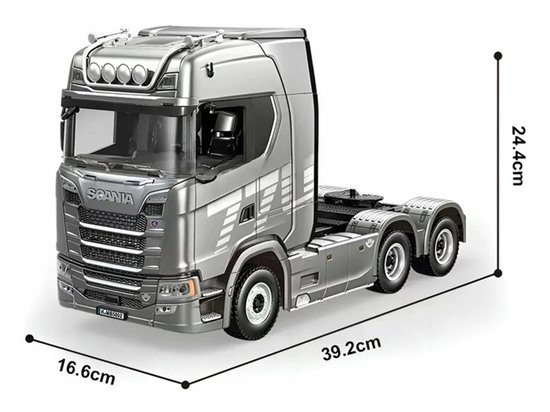 De op afstand bestuurbare Scania 770 S V8-truck is een realistisch schaalmodel van 1:18 dat indruk maakt met zijn gedetailleerde afwerking en functionaliteit. Geïnspireerd door de echte Scania-truck, heeft hij een kenmerkend uiterlijk en nauwkeurig nagebootste cabine- en carrosseriedetails.