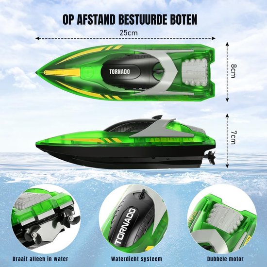 Geef je kind een supersnelle, betrouwbare en spectaculaire ervaring met de Bestuurbare Boot, groen. Bestel vandaag met korting en geniet van ononderbroken snelheid, stijl en waterplezier. Wacht niet langer en voeg deze indrukwekkende boot nu toe aan je winkelmand — dit is het cadeau dat elk kind zal koesteren!