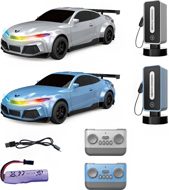1:16 Auto met afstandsbediening met licht en oplader: linksaf, rechtsaf, vooruit, achteruit, snelheid: 15 km/u, licht voor en achter. Simuleert een echt laadstation, je kunt een mobiele oplader gebruiken om op te laden/aan te sluiten en heeft een parkeerknop. Dit product is bedoeld voor kinderen ouder dan 3 jaar. Batterij: 2 x 3,7 V batterijen, 2x AAA-batterijen niet inbegrepen. Materiaal: ABS Grootte van het product: 27.5*11.5*8 Kleur: Zilveren en blauwe kleur