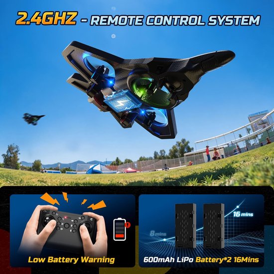 De 2,4 GHz-afstandsbediening zorgt voor een stabiele, storingsvrije verbinding zonder signaalverlies. Met headless-modus en 3 snelheidsstanden kan het RC-vliegtuig flexibel worden aangepast aan het niveau van beginners en gevorderde kinderen.