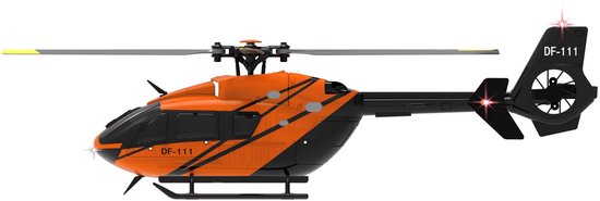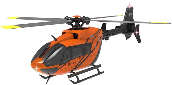 DF Models 9600 DF-111 Helikopter Ready to Fly (RTF) DF Models Top Seller.De DF-111 is een zogenaamde flybarless helikopter (zonder paddle bar). Het vlieggedrag en het vliegpatroon zijn vergelijkbaar met die van een echte helikopter. Het semi-schaalmodel heeft een vierbladige rotor met voldoende vermogen om buiten te vliegen (alleen als er geen wind is). Dankzij de drie selecteerbare snelheidsniveaus is het model geschikt voor zowel beginners als professionals. De batterij is verborgen onder de kap en kan eenvoudig worden vervangen door de kap te openen. LED-verlichting maakt het totale uiterlijk van de DF-111 helikopter compleet. Het model heeft ook een automatisch start-/landingssysteem en automatische hoogtestabilisatie (het model handhaaft automatisch de opgegeven hoogte).Inhoud:RC-helikopter - Ready to Fly (RTF)2,4 GHz afstandsbedieningLiPo-batterij 7,4 Volt - 350 mAhUSB-oplaadkabelHandleidingTechnische gegevens:Vliegtijd: tot 10 minutenRotordiameter: 256 mmLengte: 305 mmBreedte: 65 mmHoogte: 91 mmGewicht: ca. 100 g