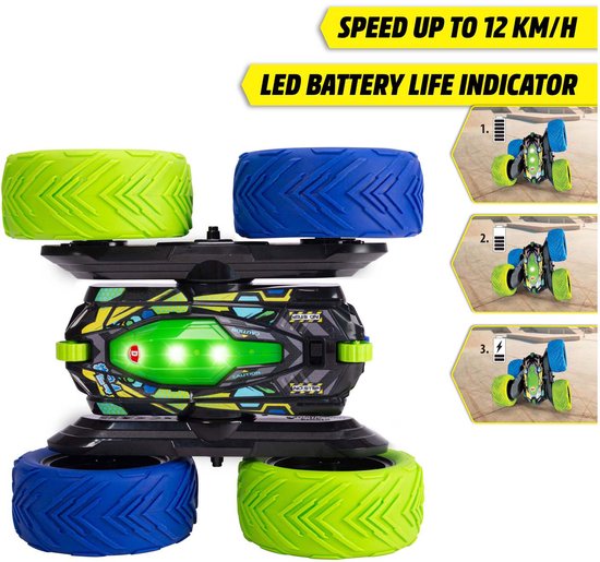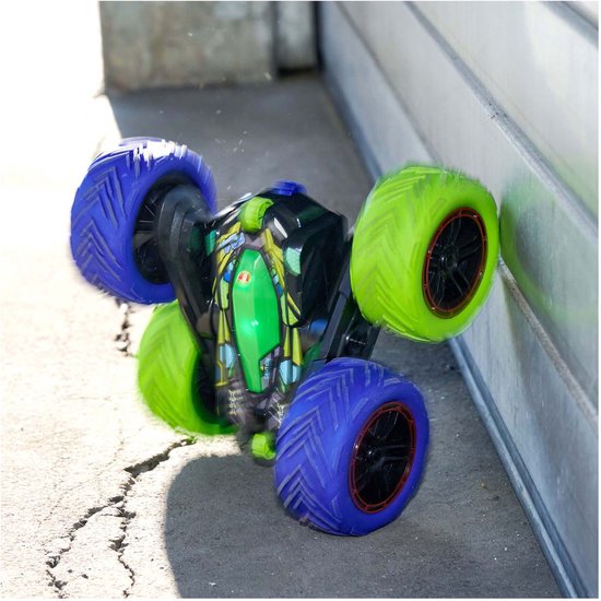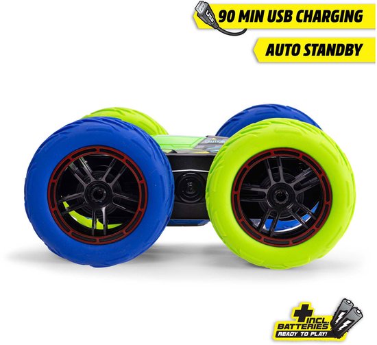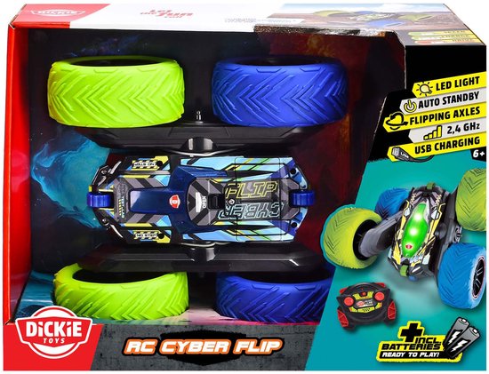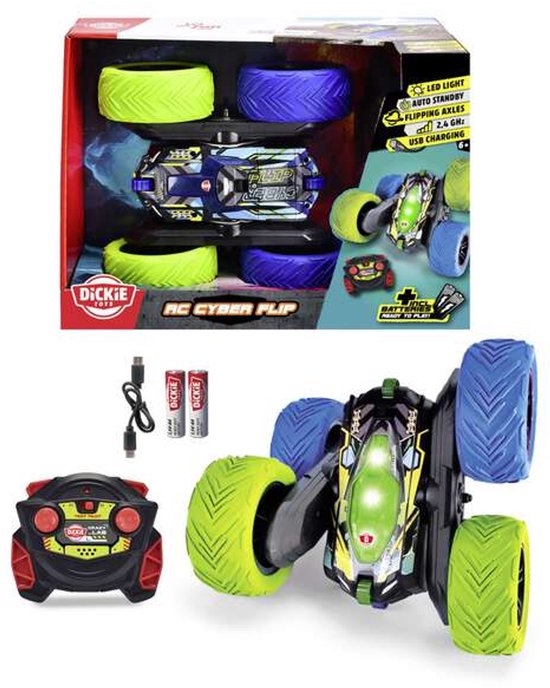 Beleef spectaculaire stunts met de Dickie Toys RC Cyber Flip! Deze 22 cm lange stuntauto rijdt aan beide zijden, maakt flips en spins, en haalt snelheden tot 12 km/u. Met LED-verlichting, 2.4 GHz afstandsbediening en USB-oplaadfunctie is hij klaar voor elke actie. Inclusief batterijen. Geschikt voor kinderen vanaf 6 jaar.