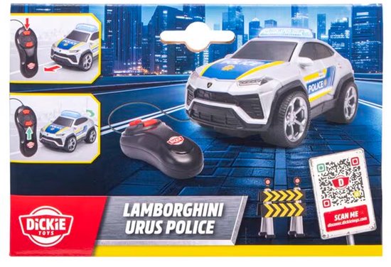 Scheur door de straten met de bestuurbare Dickie Toys RC Lamborghini Urus Policecar. Deze stoere politieauto is geschikt voor kinderen vanaf 3 jaar.