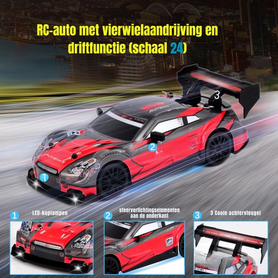 Deze op afstand bestuurbare raceauto is ontworpen als een GTR-model op schaal 1:24, met oog voor detail en een sportieve uitstraling. Het realistische ontwerp maakt het spelen extra meeslepend en geeft het gevoel van echte autosport. Hierdoor wordt elke race een unieke en levendige ervaring.