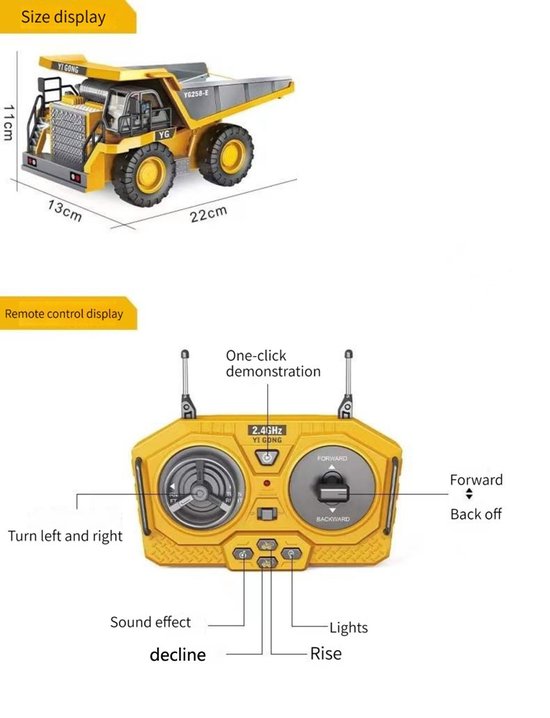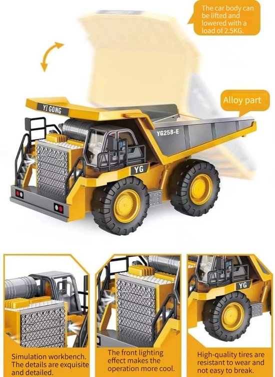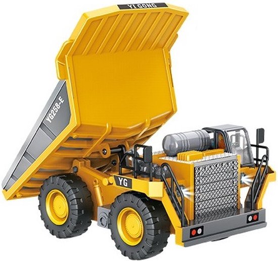 Dit is een bestuurbare dump truck met 9 kanalen: Dit houdt in dat de truck 9 verschillende handelingen kan uitvoeren. Denk hierbij aan links of naar rechts sturen. Achteruit en vooruit rijden. De bak naar boven en benden brengen. Het beschikt ook over een lamp functie die je kan aanzetten. Tot slot heeft de dump truck een hele sterke motor en kan hij ook nog eens een gewicht dragen tot wel 3 kg.