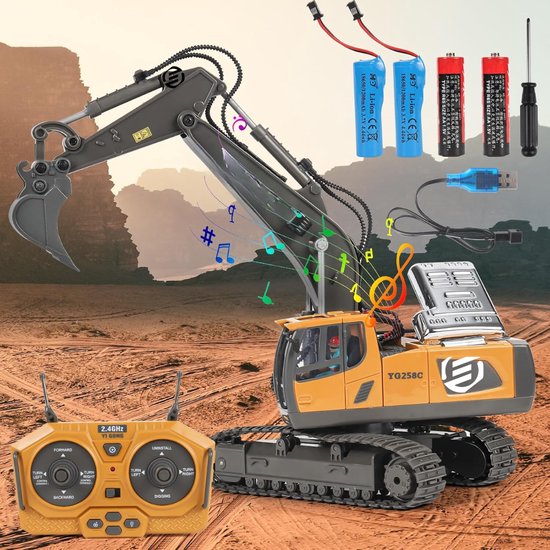De graafmachine wordt geleverd met twee 1200 mAh batterijen, die zorgen voor een lange speelduur. Kinderen kunnen hierdoor langer spelen zonder onderbrekingen. De 2,4 GHz afstandsbediening met twee joysticks biedt een grote signaaldekking, waardoor meerdere graafmachines tegelijkertijd kunnen worden bediend zonder interferentie.