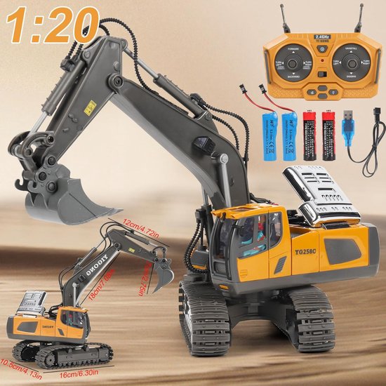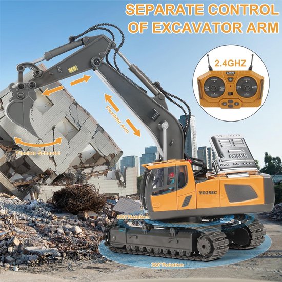 - Volledig functioneel: 11-kanaals bediening met 360°-rotatie, 680°-cabinerotatie, en realistische graafbewegingen.