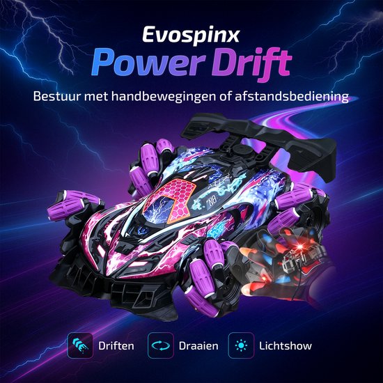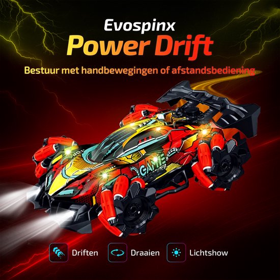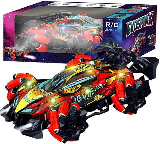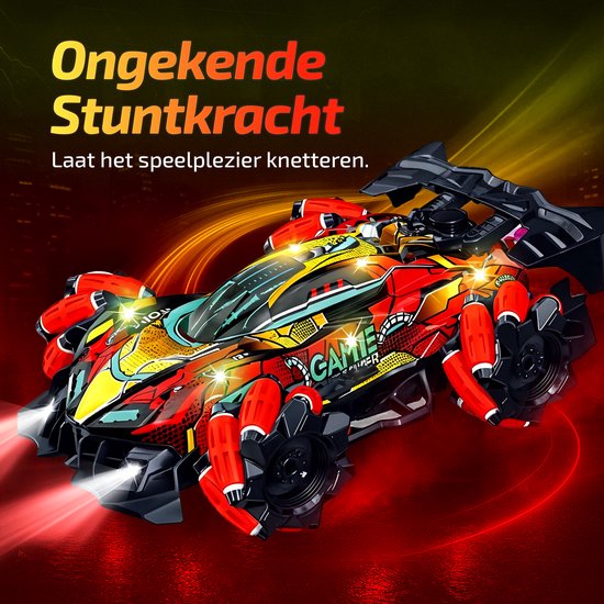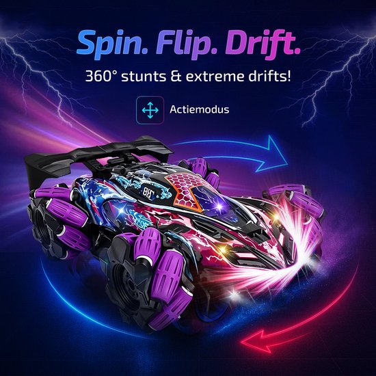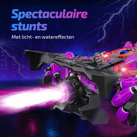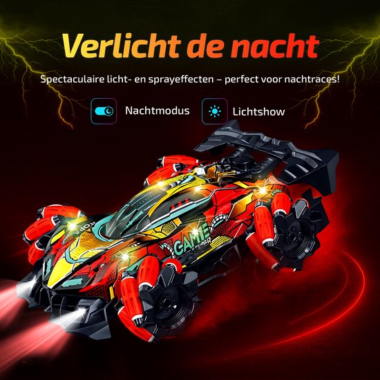 Spectaculaire stunts met licht en sprayZodra je gas geeft, komt de auto tot leven. De felle LED-verlichting zorgt voor een opvallend effect, terwijl de ingebouwde sprayfunctie een rookachtig effect creëert tijdens het rijden.
