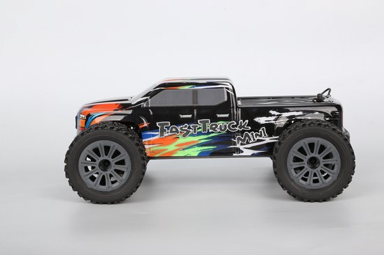 DF Models 3136 FastTruck Mini - 1/16 Ready to Run DF Models 2025. Eerste uitlevering 05-2025.De nieuwe mini-modellen op schaal 1:16 van DF Models zijn de perfecte keuze voor RC-fans van alle leeftijden! Met de FighterTruggy Mini en de FighterTruck Mini is er voor elk wat wils. De modellen zijn uitgerust met een krachtige motor en een hoogwaardige controller en worden aangedreven door een 7,4 volt LiPo-accu, waarmee topsnelheden tot 45 km/u kunnen worden bereikt. Het honingraatchassis zorgt voor een hoge torsiestijfheid en stabiliteit, terwijl de 4WD-aandrijving in combinatie met het goed afgestelde chassis en de ophanging een eersteklas rijervaring biedt. De modellen worden kant-en-klaar geleverd met een 2,4 GHz-afstandsbediening, LiPo-accu en oplader (USB-oplaadkabel). De carrosserie heeft een praktisch klapmechanisme waardoor de accu en het chassis gemakkelijk toegankelijk zijn. Met LED-verlichting in de bumpers is rijden in de schemering of in het donker een echt hoogtepunt. Dankzij een schakelbare functie op de afstandsbediening kan de maximumsnelheid eenvoudig worden verlaagd (maximumsnelheid 100 - 75 - 50 % instelbaar!), waardoor de modellen ook geschikt zijn voor beginners. Koop nu technisch geavanceerde modellen met hoge prestaties voor een onverslaanbare instapprijs en dompel jezelf onder in de wereld van RC-sport!Inhoud:RC-auto Ready to Run (RTR)2,4 GHz afstandsbedieningLiPo-accu - 7,4 Volt - 1800 mAhUSB-oplaadkabelHandleidingTechnische gegevens:Schaal: 1:16Aandrijving: 4WD geborsteldLengte: 265 mmBreedte: 210 mmHoogte: 110 mmWielbasis: 180 mmBanden: 70*36 mmGewicht: ca. 850 gSnelheid: tot 45 km/u mogelijkBenodigde accessoires (niet inbegrepen):4x AA-batterijenUSB-stekkervoeding (min. 10 watt)