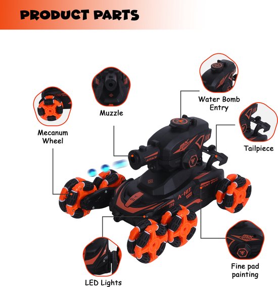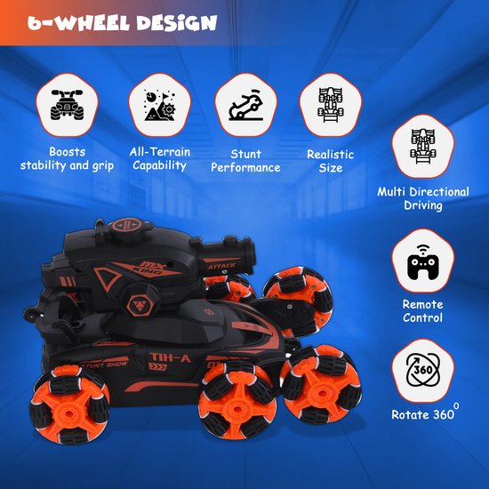 De FUNFY 1:16 6-Wheel RC Auto is een krachtige afstandsbestuurbare stuntauto ontworpen voor avontuur en actie. Met 6 wielen, 4WD aandrijving en een 45° klimfunctie rijdt deze RC auto moeiteloos over verschillende terreinen. Het realistische mist effect maakt het rijden nog spectaculairder. Dankzij de oplaadbare batterij en robuuste off-road banden is deze RC auto perfect voor indoor en outdoor speelplezier. Een geweldig cadeau voor kinderen die van RC auto's houden.