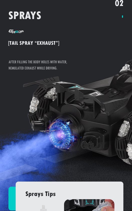 Deze auto rijdt op bijna iedere ondergrond, is voorzien van een spray/took functie, roteert 360 graden en is heel gemakkelijk wendbaar.