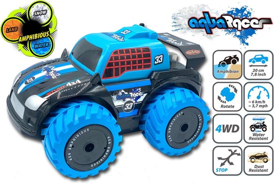 De op afstand bestuurbare Gear2Play RC Amfibie AquaRacer is een terreinwagen en boot in 1. Dit amfibie voertuig rijdt met een max. snelheid van 6 km/u over land en door sneeuw, want met zijn all terrain 4x4 banden kan hij alle off-road ondergronden perfect aan. De stoere 2.4 GHz AquaRacer maakt ook 360 graden spins! Door zijn waterproof body rij je hem zonder problemen het water in, nu zal hij als een echte boot kunnen varen op het water! Afmeting auto: 20x15x12cm (lxbxh). Afmeting verpakking: 29,5x18x19,5cm (lxdxh). Batterij info: Auto: 4 x AA batterijen (niet meegeleverd) - Controller: 2 x AA batterijen (niet meegeleverd). Leeftijdsindicatie: 6 jaar+.