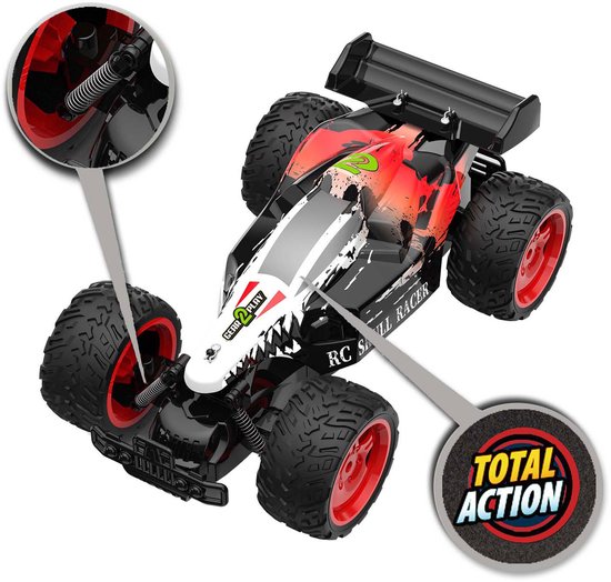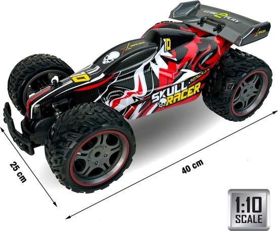 De RC Skull Racer is een grote op afstand bestuurbare raceauto met een schaal van 1:10 (afmeting: 40 x 25 x 15cm lxbxh). De sportieve Skull Racer heeft een geveerde vooras en door de krachtige elektromotor kan de racer een snelheid van ca. 6 km per uur bereiken. Zijn duurzame terreinbanden met extra grip kunnen met gemak alle ondergronden aan! Gebruik: in- en outdoor. Frequentie: 2.4 Ghz. Bereik: ca. 25 meter. Leeftijdsindicatie: 5 jaar+.