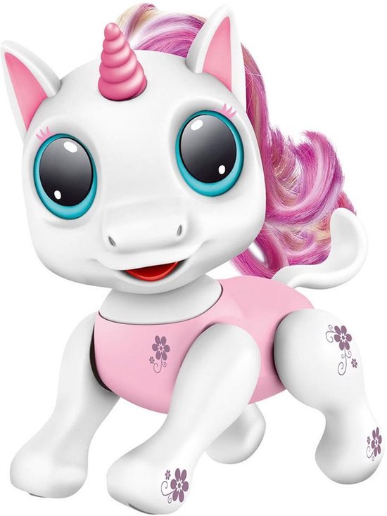 Robo Smart Unicorn is een schattige, interactieve robotunicorn voorzien van LED verlichte ogen, verschillende geluiden en sensoren, waardoor Smart Unicorn zal reageren op geluid en aanraking. Robo Smart Unicorn kan lopen, zitten, opstaan en maakt geluiden. Als ze honger krijgt is ze niet zo blij en moet je haar onder haar kin blijven aaien tot ze vol zit. Dan is zij weer vrolijk en zal ze voor je gaan dansen op vrolijke muziek! Haar lange roze/paarse manen kun je kammen en stylen. Jouw schattige Smart Unicorn wil altijd met jou spelen!
