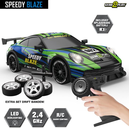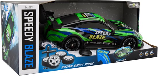 Voor echte driftfans wordt de Speedy Blaze geleverd met een extra set banden. Wissel de banden en laat de auto soepel glijden voor spectaculaire drifts. Pak de afstandsbediening en ervaar hoe leuk racen en driften kan zijn met de Gear2Play Speedy Blaze! Frequentie: 2.4 GHz. Leeftijdsindicatie: 5+ jaar.