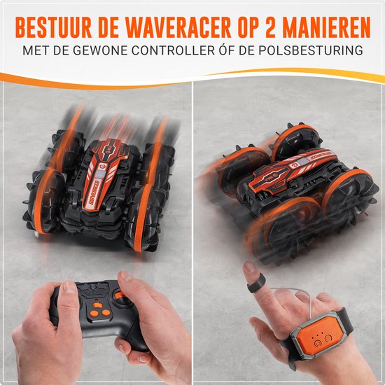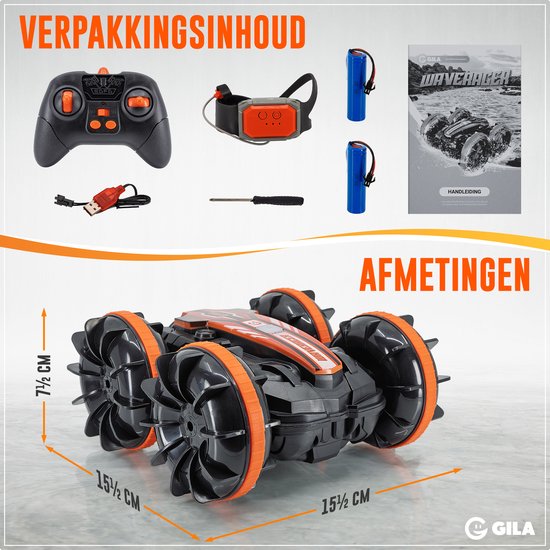 De GILA WaveRacer is dé ultieme stuntauto voor jonge avonturiers! Dankzij het amfibische ontwerp scheurt hij moeiteloos over land én water. Met één druk op de knop of een simpele polsbeweging laat je hem draaien, flippen en stunten in alle richtingen.