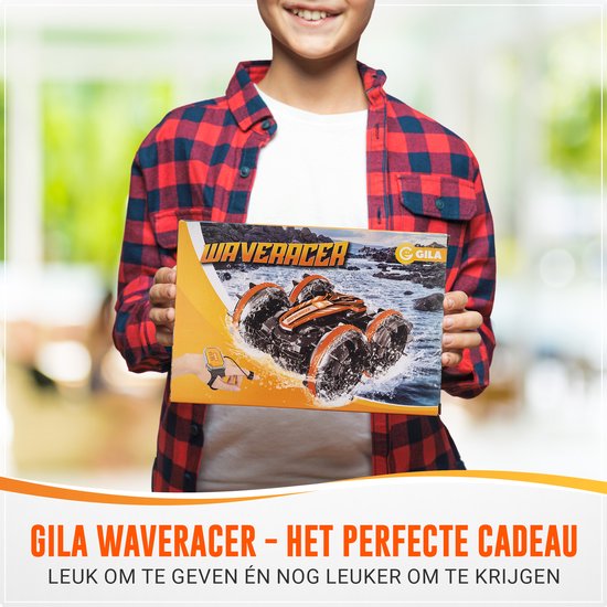 De GILA WaveRacer is dé ultieme stuntauto voor jonge avonturiers! Dankzij het amfibische ontwerp scheurt hij moeiteloos over land én water. Met één druk op de knop of een simpele polsbeweging laat je hem draaien, flippen en stunten in alle richtingen.