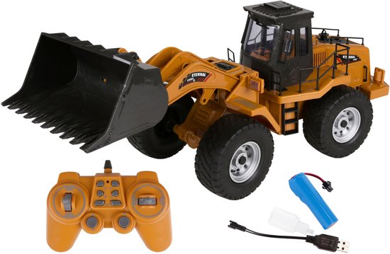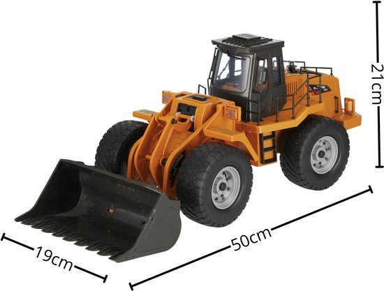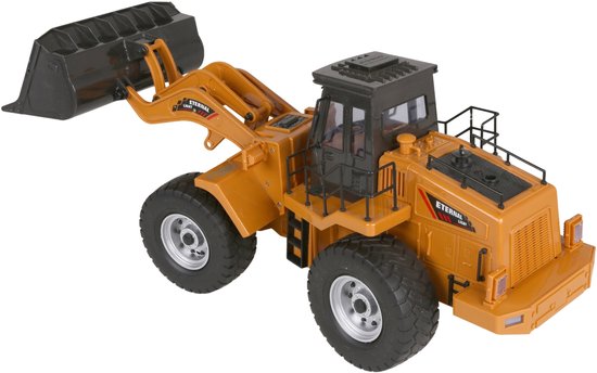 De op afstand bestuurbare bulldozer op schaal 1:8 heeft een beweegbare schacht voor het realistisch laden en lossen van zand of grind.