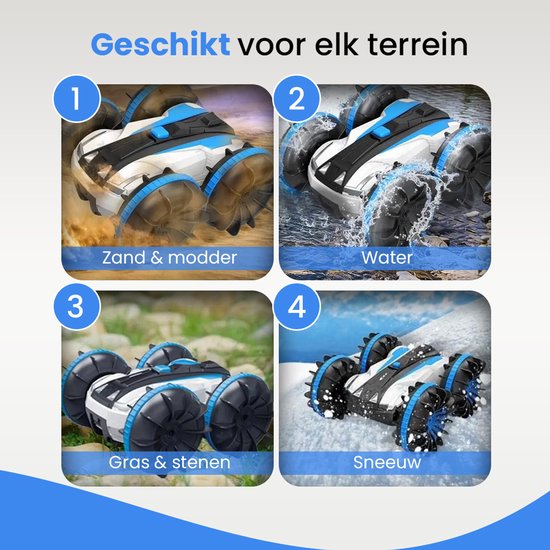 De GT RC bestuurbare auto is een krachtige all-terrain stunt auto die ontworpen is voor maximale actie op elk oppervlak. Deze radiografisch bestuurbare auto combineert de eigenschappen van een RC auto en een bestuurbare boot, waardoor spelen mogelijk is op het land én in het water. Dankzij het amfibische ontwerp rijdt deze RC car moeiteloos door plassen, over gras, zand en zelfs sneeuw.