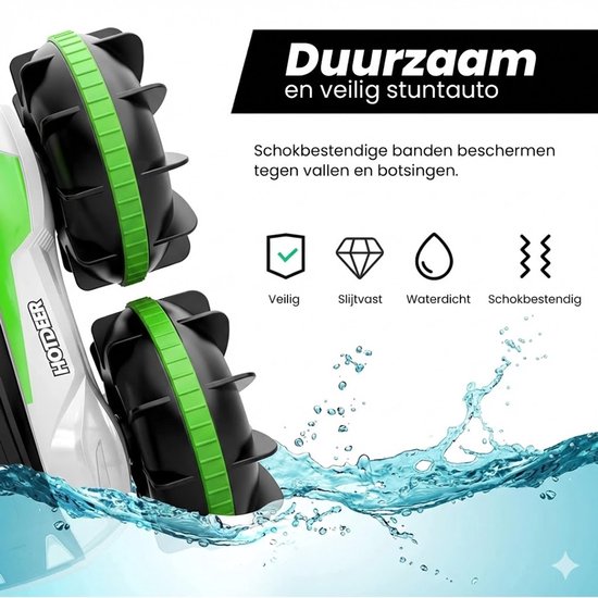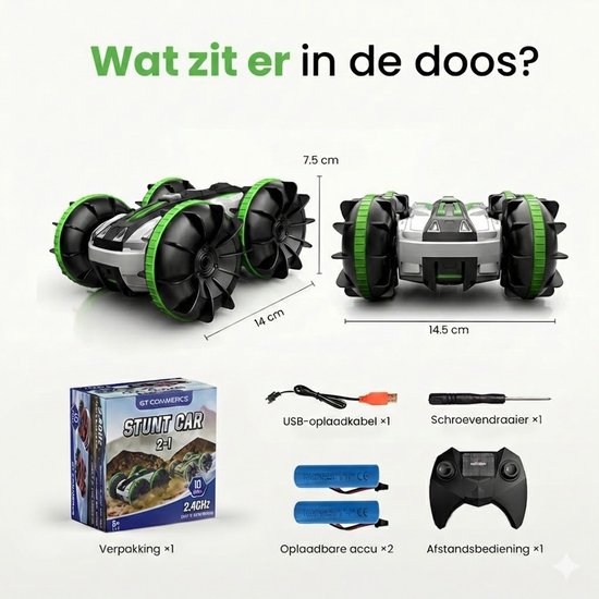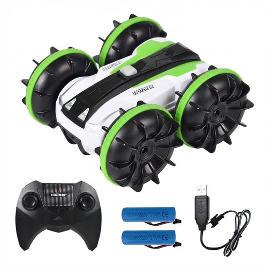 De GT RC bestuurbare auto in groene uitvoering is een stoere all-terrain stunt auto die speciaal is ontworpen voor actief spelen op elk oppervlak. Deze radiografisch bestuurbare auto combineert de functies van een RC auto en een bestuurbare boot, waardoor kinderen kunnen rijden op het land én in het water. Dankzij het amfibische ontwerp is dit speelgoed ideaal voor buitengebruik.