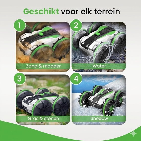 Deze bestuurbare auto voor buiten is geschikt voor meerdere ondergronden. Op het land functioneert hij als krachtige RC auto, terwijl hij in het water verandert in een bestuurbare boot. Hierdoor valt dit speelgoed binnen zowel de categorie afstandsbestuurbare auto’s als RC boten.