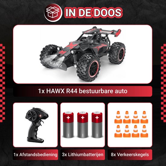 Ben jij klaar om pure snelheid en ultieme controle te ervaren? De HAWX R44 bestuurbare auto combineert stoere looks, krachtige prestaties en hoge wendbaarheid tot één razendsnelle off-road machine. Dankzij zijn lichtgewicht ontwerp, sterke grip en schokbestendige constructie is dit de perfecte keuze voor wie elke ondergrond wilt veroveren.