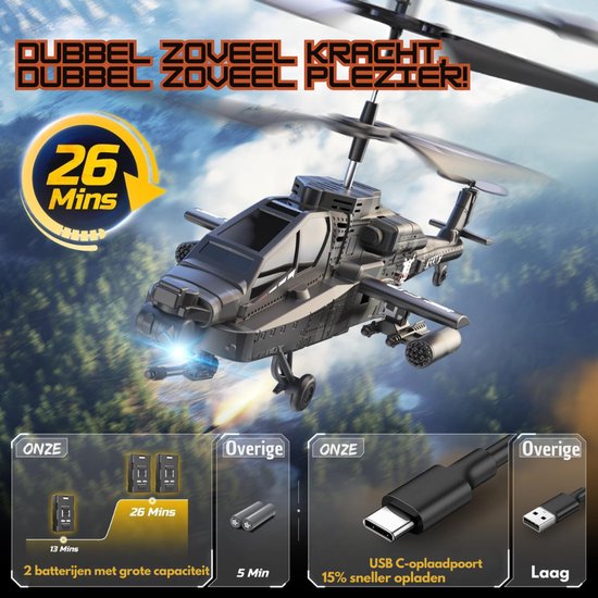 De helikopter wordt geleverd met twee USB-C oplaadbare batterijen voor extra lange vliegtijd en snelle oplaadmomenten. Dankzij de lage-batterijwaarschuwing kun je altijd veilig landen zonder verrassingen.