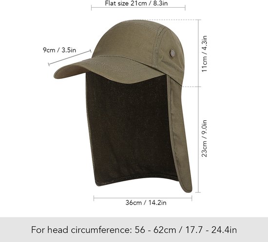 5. Perfect voor vissen, wandelen, kamperen, jagen, tuinieren, fietsen, varen, enz. in de buitenlucht. 6. Eén maat, geschikt voor een hoofdomtrek van 45-62 cm.