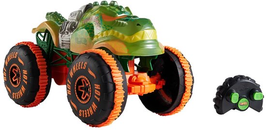 - Voel de kracht van de Hot Wheels Monstertrucks RC Rageasaurus met Grip Action banden en voer verpletterende acties uit met de afstandsbediening.